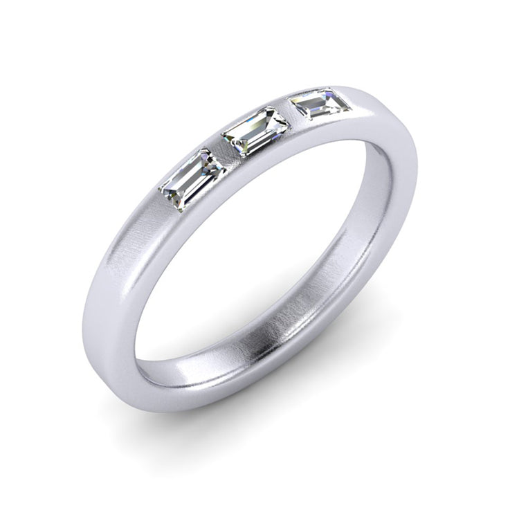 Hand forged Platinum 3.5mm Ring with Three Baguette Cut Diamonds. The Platinum we use is specially imported for its strength and durability ensuring our wedding rings are enjoyed for a lifetime.