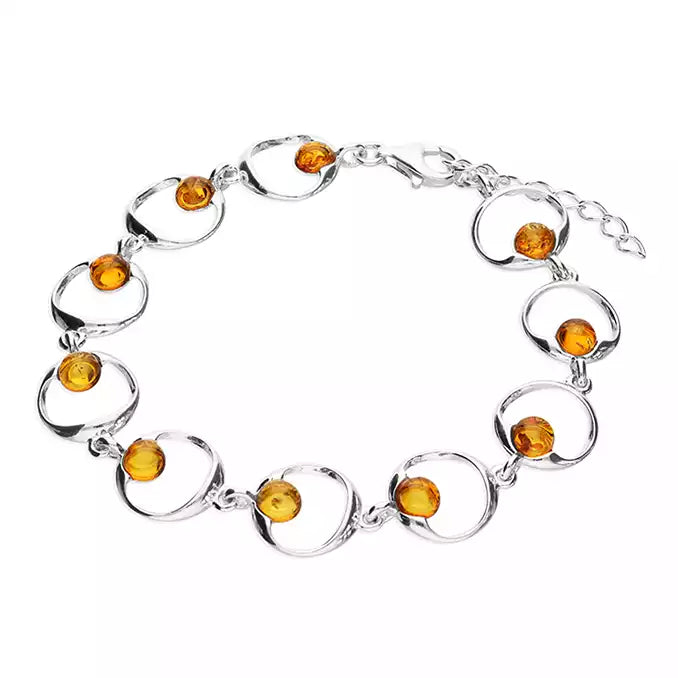 A Sterling Silver bracelet with a cognac amber bead situated off centre within a silver circle.