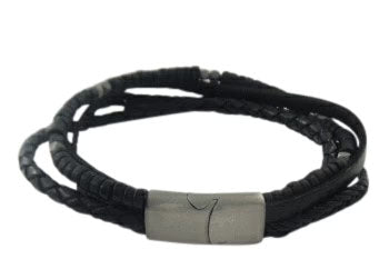 Men's multi elements beaded and black leather bracelet with simple matt finished silver magnetic clasp.
