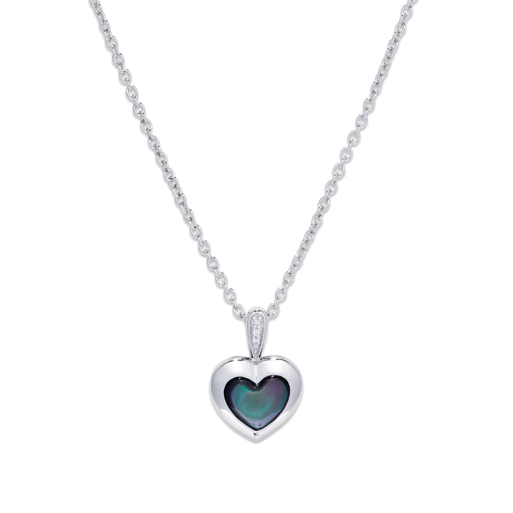 A polished silver heart shaped pendant with a black Mother of Pearl stone and Cubic Zirconia details on the bale.