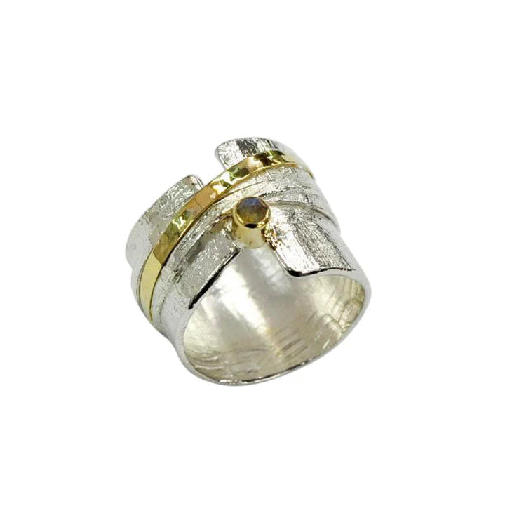 Strap wraps ring with labradorite centerpiece in 9 carat gold.