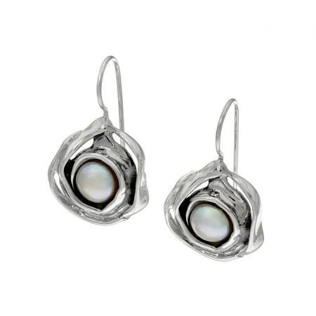 Organic, wave drop earrings with white fresh water pearl.