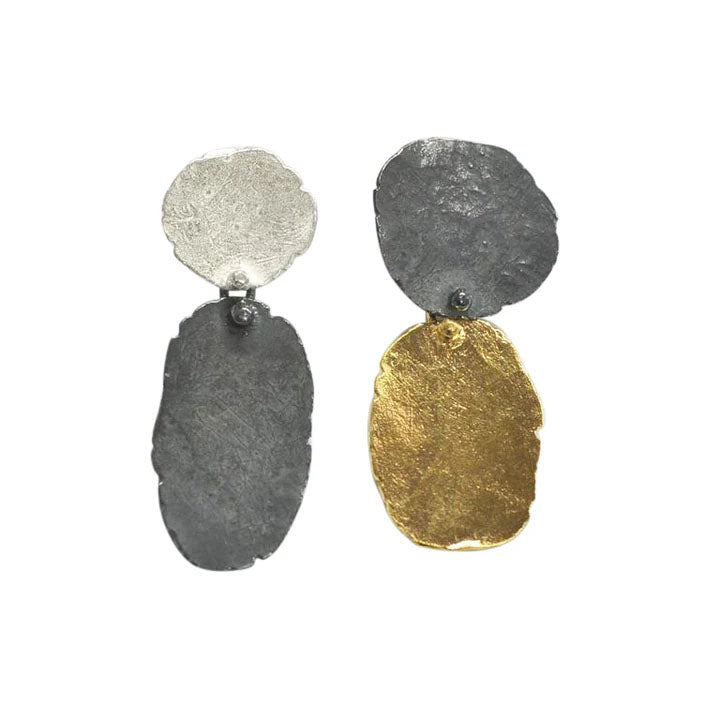 Asymmetric three colour drops finished in gold plated and oxidised silver.