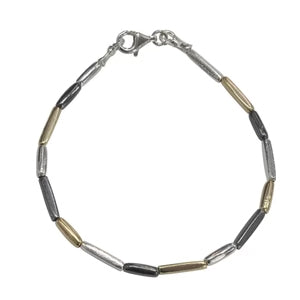 Three colour, organic, sleek tube bracelet with silver, Gold plated and oxidised finish.