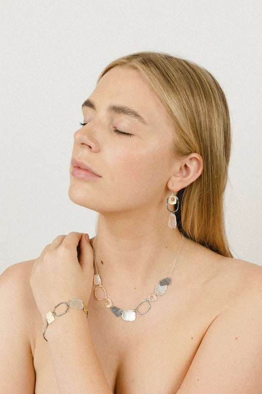 Three colour, multi element organic half necklace with an oxidised and gold plated finish.