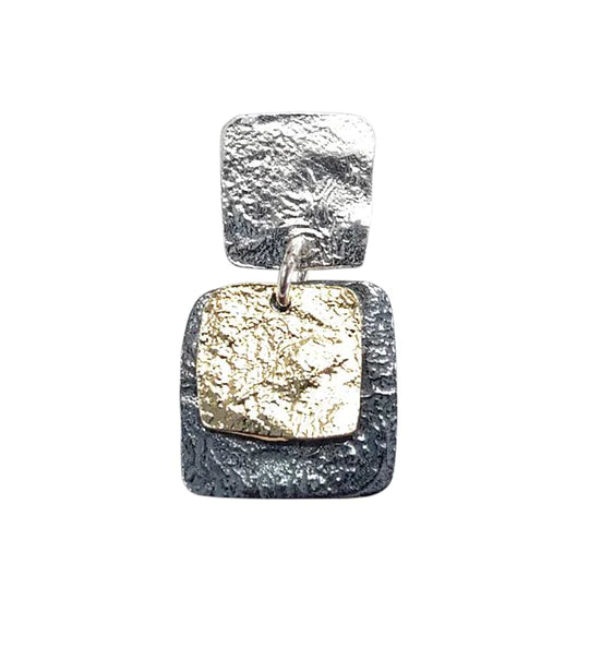 Three colour, multi layered design, organic pendant with a gold plated, silver and oxidised finish.