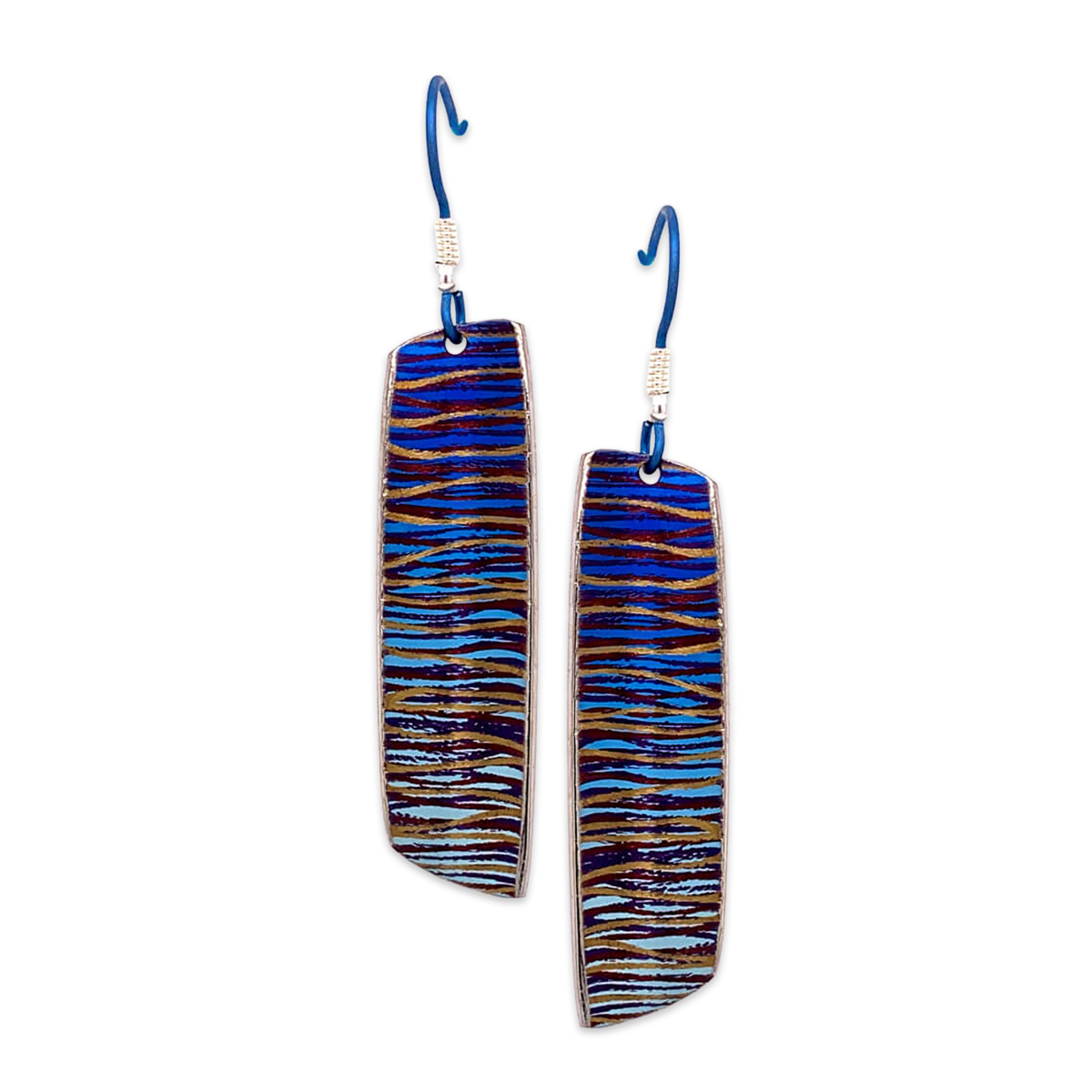 A colourful Ti2 Titanium drop earring with a swirl pattern.