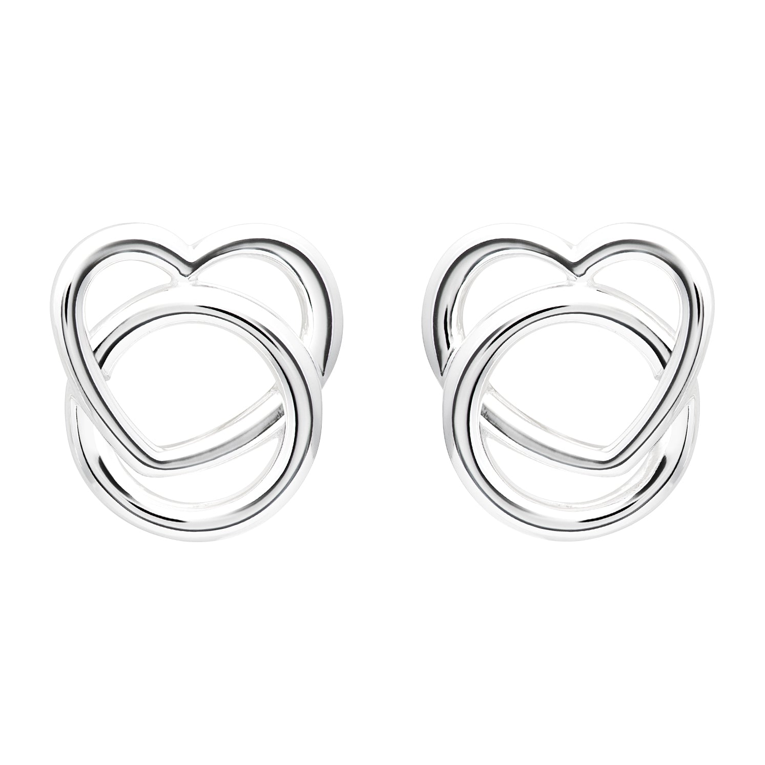 Contemporary entwined heart and circle studs with a polished finish.