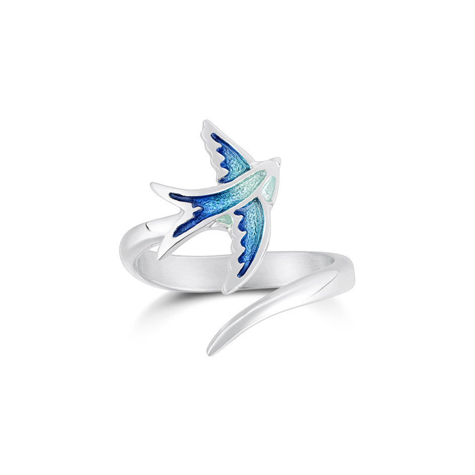 ER197-SUMBL MThis sterling silver Swallows Ring features a single enamelled swallow on a silver ring, the curving band mimicking the bird’s elegant flight through the sky. The design is hand-enamelled in Summer Blue enamel.