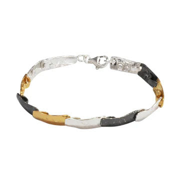 Three colour curved element bracelet with a silver, oxidised and gold plated finish.