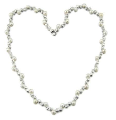 Beautiful white fresh water pearl and bezel set Cubic Zirconia full necklace.