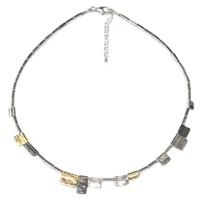 Silver colour hematite beaded necklace with three colour silver elements, gold plated, oxidised and silver finish.