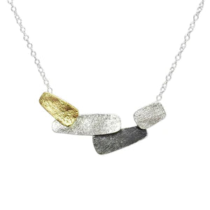 Square element pendant necklace with silver, oxidised and gold plated finish.