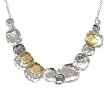 Multi square element statement half necklace with a silver, gold plated and oxidised finish.