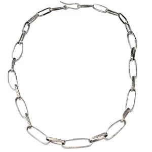 Organic oval link necklace with a oxidised silver finish and hook fastening.