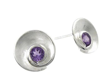 Detailed swirl stud earrings featuring Amethyst stones with a polish and matt finish.