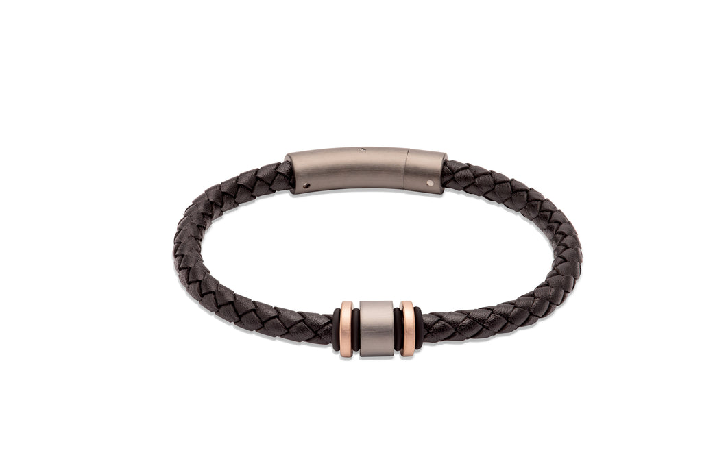 A black leather bracelet with gun metal matte IP plated steel pusher clasp. It has gun metal and matte rose IP plated steel elements.