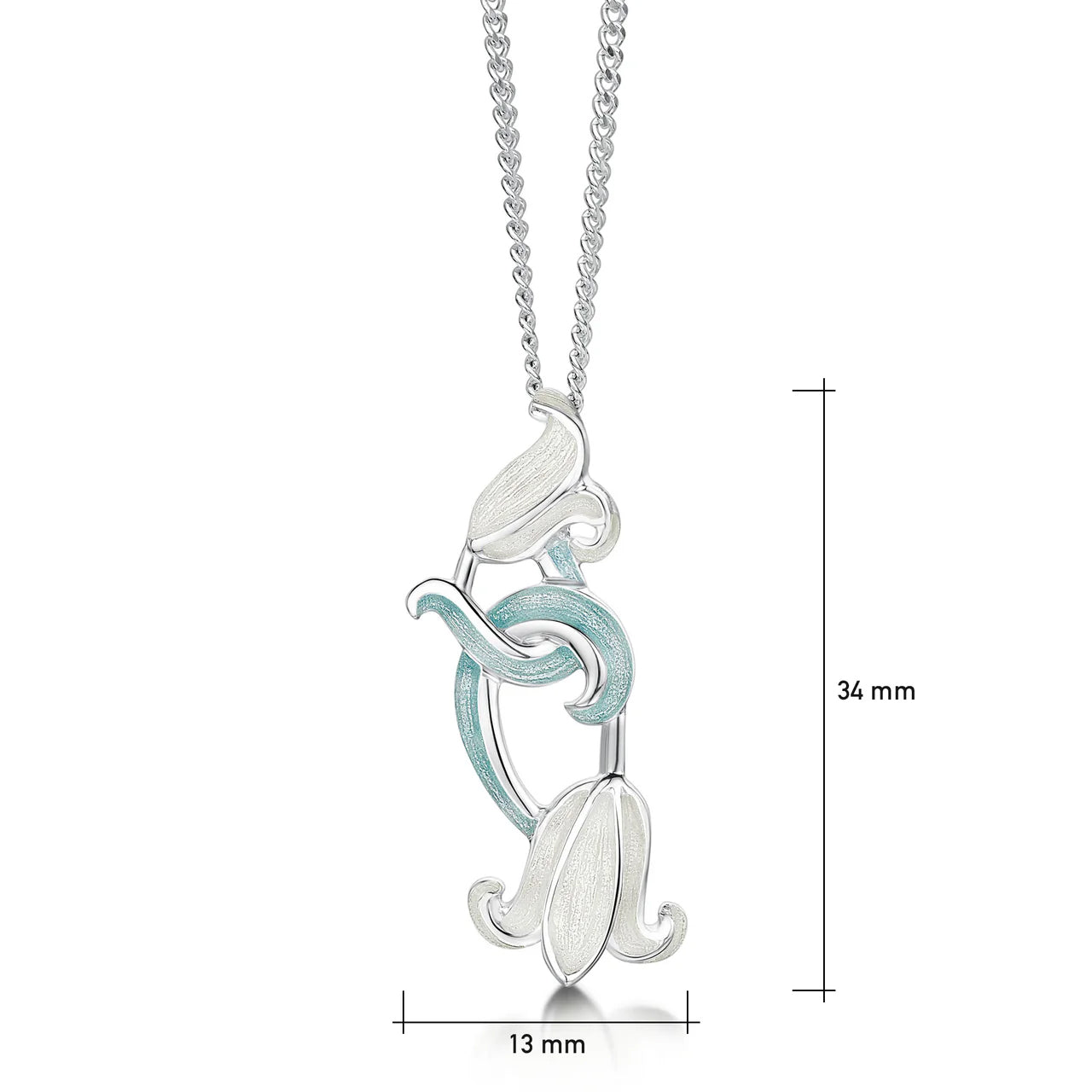 EP241WHITEBELLThis Bluebell pendant necklace features two bluebells, flowering from an enamelled stem. The design hangs from a sterling silver curb chain and is hand-enamelled in 'Whitebell' enamel.