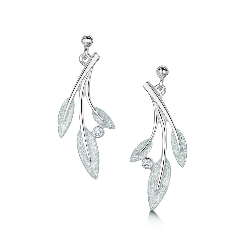 ESE158-FROSTThese sterling silver Rowan Drop Earrings feature three leaves in Frost enamel on flowing silver branches. Each earring is beautifully enhanced with a cubic zirconia, set by hand in our Orkney Workshop.